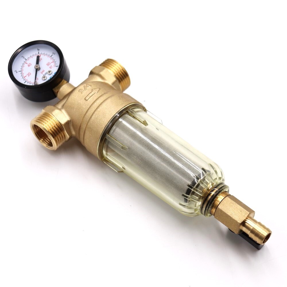 Промывной фильтр с манометром для систем холодного водоснабжения. Обеспечивает тонкую очистку воды и имеет функцию ручной обратной промывки для восстановления работоспособности. Корпус выполнен из латуни, колба — из ударопрочного прозрачного пластика для визуального контроля степени загрязнения.