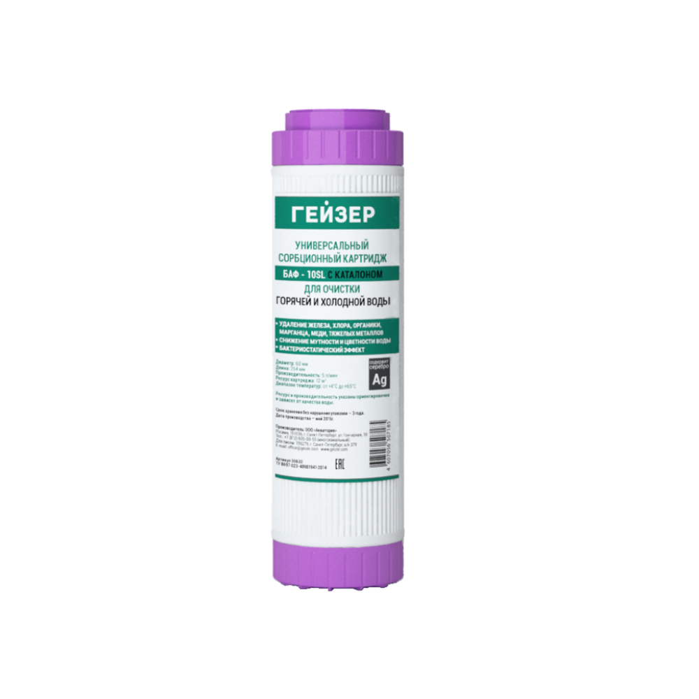 БАФ - 10SL -картридж засыпного типа для очистки питьевой воды, может быть использован как одноступенчатый фильтр, так и в составе тройки на 2-ой и 3 –й ступени. Основное предназначение - очистка воды от остаточного хлора, органических соединений и железа при содержании до 2 мг/л.