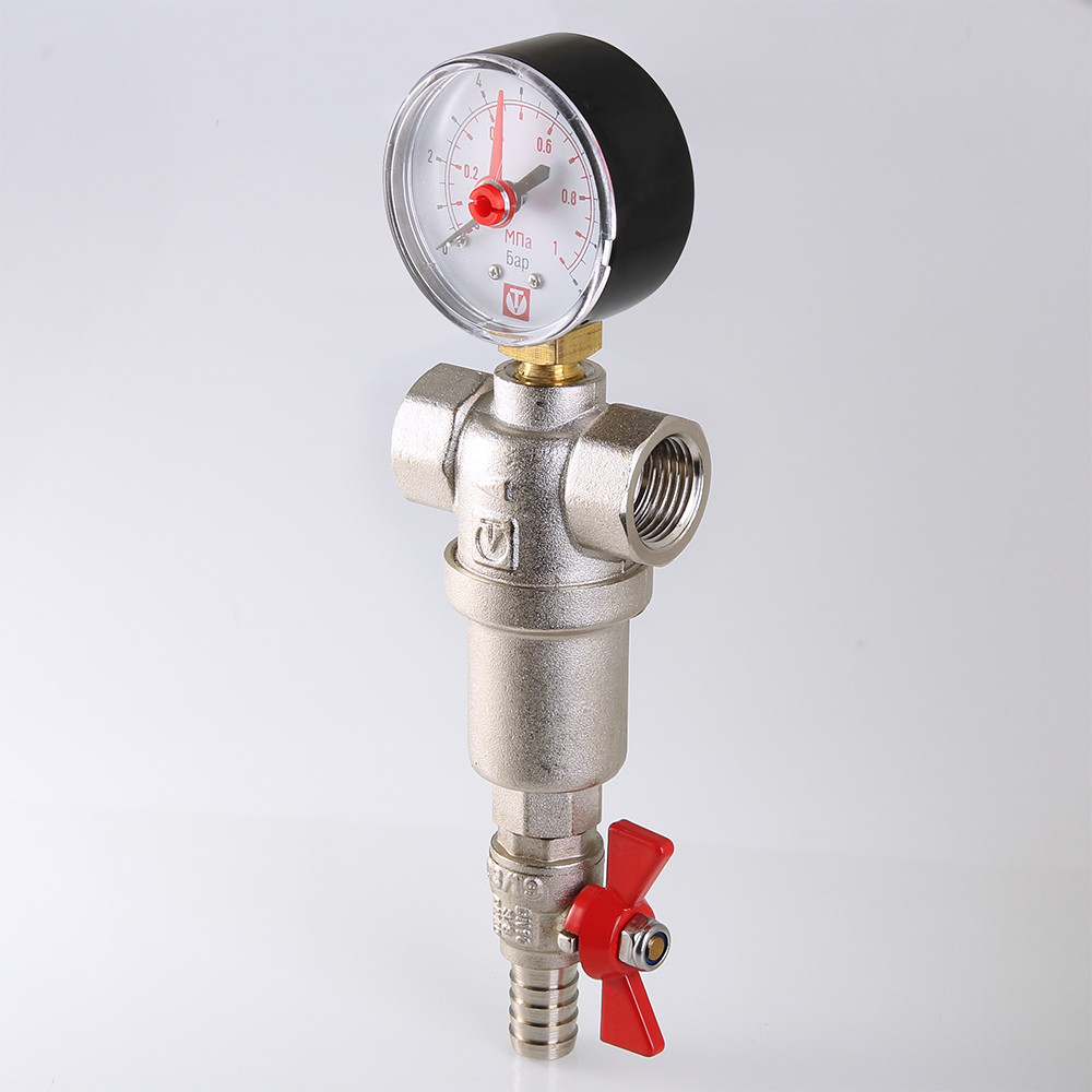 Предусмотрены дренажный шаровой кран со штуцером для подключения шланга и манометр для контроля уровня загрязненности сеток. Фильтр монтируется в вертикальном положении, колбой вниз. Резьба присоединений – внутренняя.