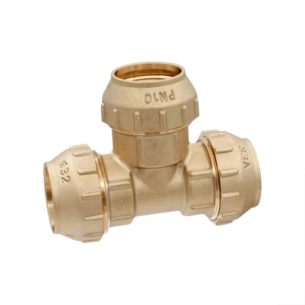 Латунный компрессионный тройник предназначен для создания Т-образного ответвления в трубопроводах из полиэтилена (ПНД). Фитинг обеспечивает надежное и герметичное соединение трех труб одинакового диаметра 32 мм. Изделие применяется в системах питьевого и технического водоснабжения.