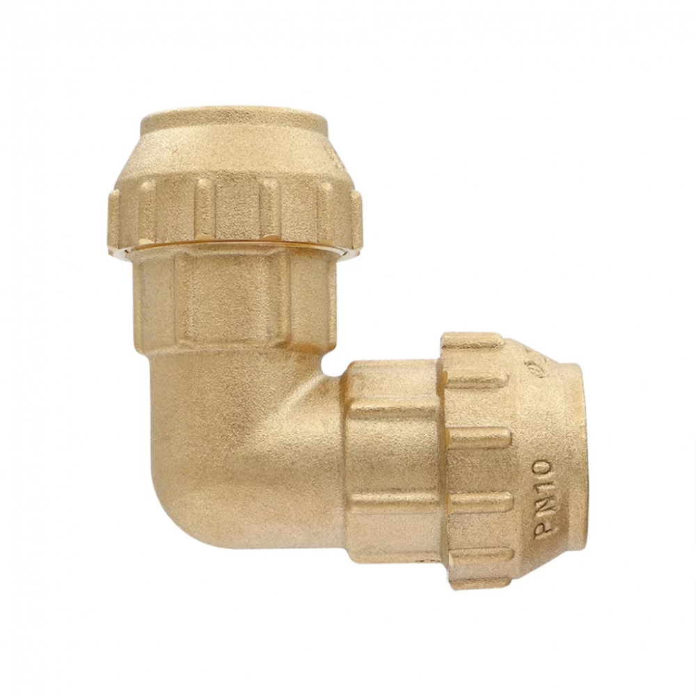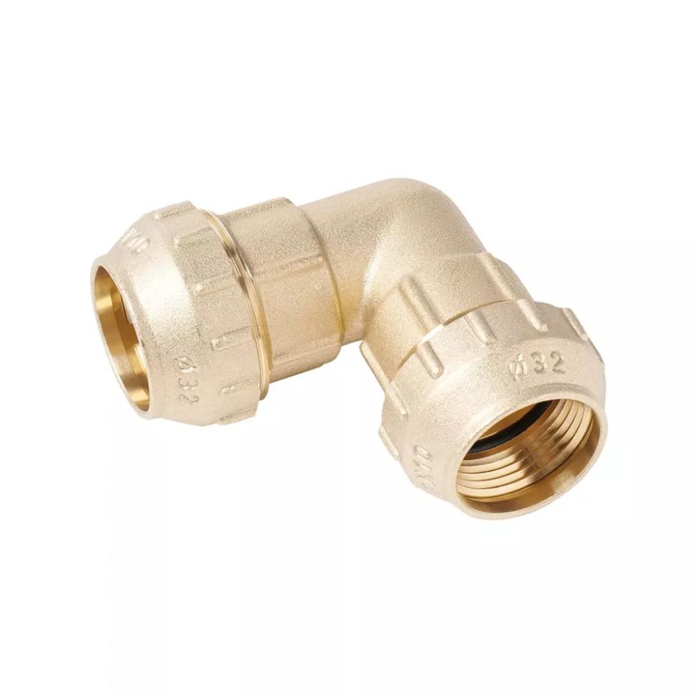Равнопроходной компрессионный угольник из латуни, предназначенный для соединения двух полиэтиленовых труб диаметром 32 мм под прямым углом. Фитинг применяется при монтаже систем питьевого и хозяйственного водоснабжения. Конструкция обжимного соединения обеспечивает высокую герметичность и простоту монтажа.