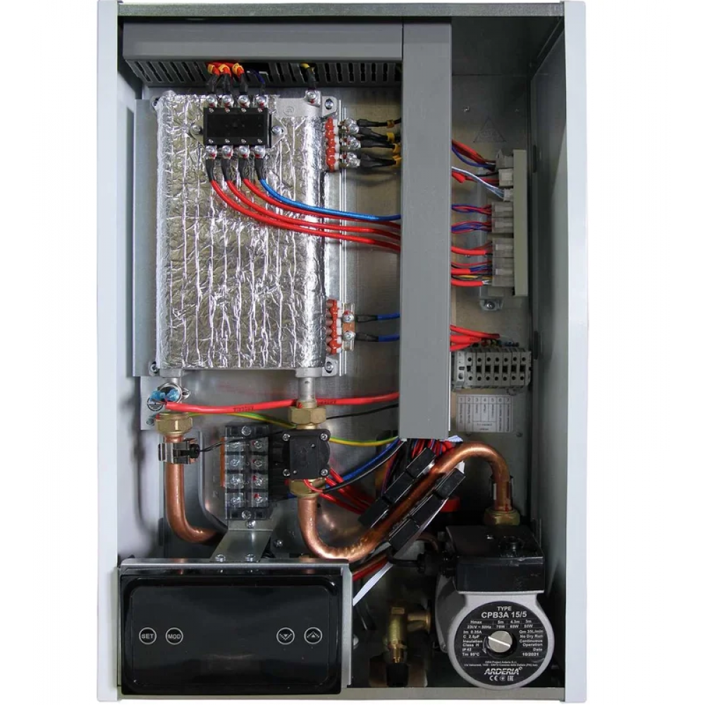 Настенный электрический котел Arderia E 16 — компактное решение для отопления квартир, частных домов и коммерческих помещений. Модель мощностью 16 кВт обеспечивает нагрев теплоносителя, а при подключении бойлера косвенного нагрева может использоваться и для ГВС. Конструкция сочетает небольшой размер (610×390×190 мм) с полным набором встроенных элементов для автономной работы