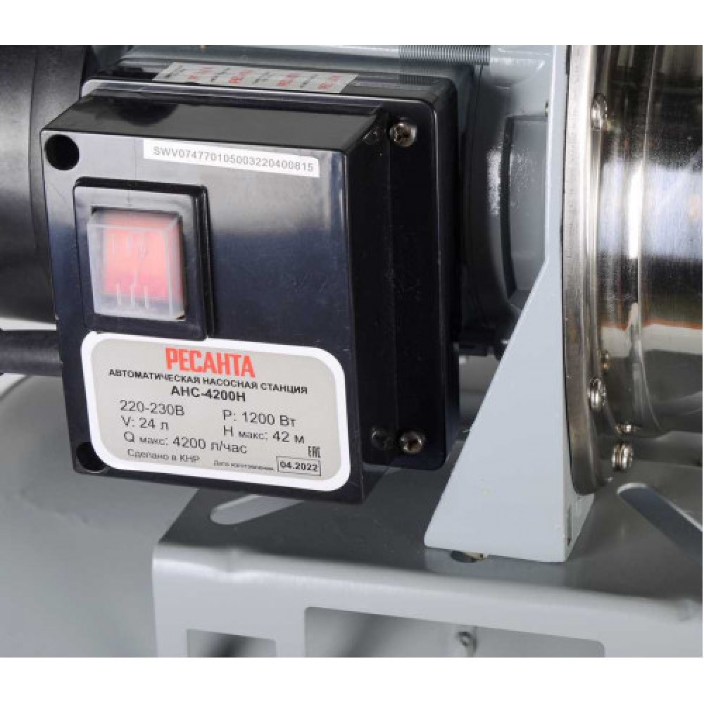 Автономная насосная станция Ресанта АНС-4200Н мощностью 1200 Вт, максимальным напором 42 м и подачей до 4200 л/ч (≈70 л/мин) предназначена для автоматического водоснабжения коттеджа и дачи с постоянным давлением в трубопроводе.