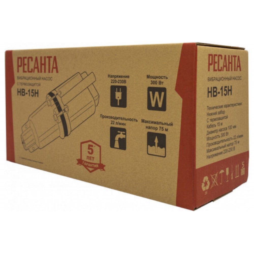 Вибрационный насос Ресанта НВ-15Н полезной мощностью 300 Вт, максимальной высотой подъема воды 75 м и производительностью до 22 л/мин предназначен для подачи воды из скважин (внутренний диаметр от 110 мм и более), а также из колодцев, резервуаров и открытых водоемов.