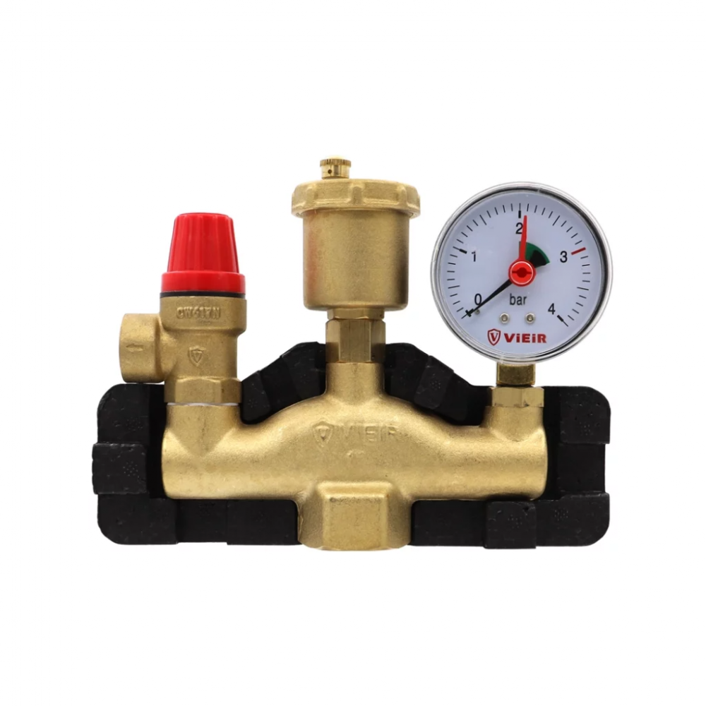 Группа безопасности котла VIEIR AQ1063B 1" 3 бар в теплоизоляции предназначена для автономных систем водяного отопления и ГВС, ограничивая давление в системе установленным предохранительным клапаном.