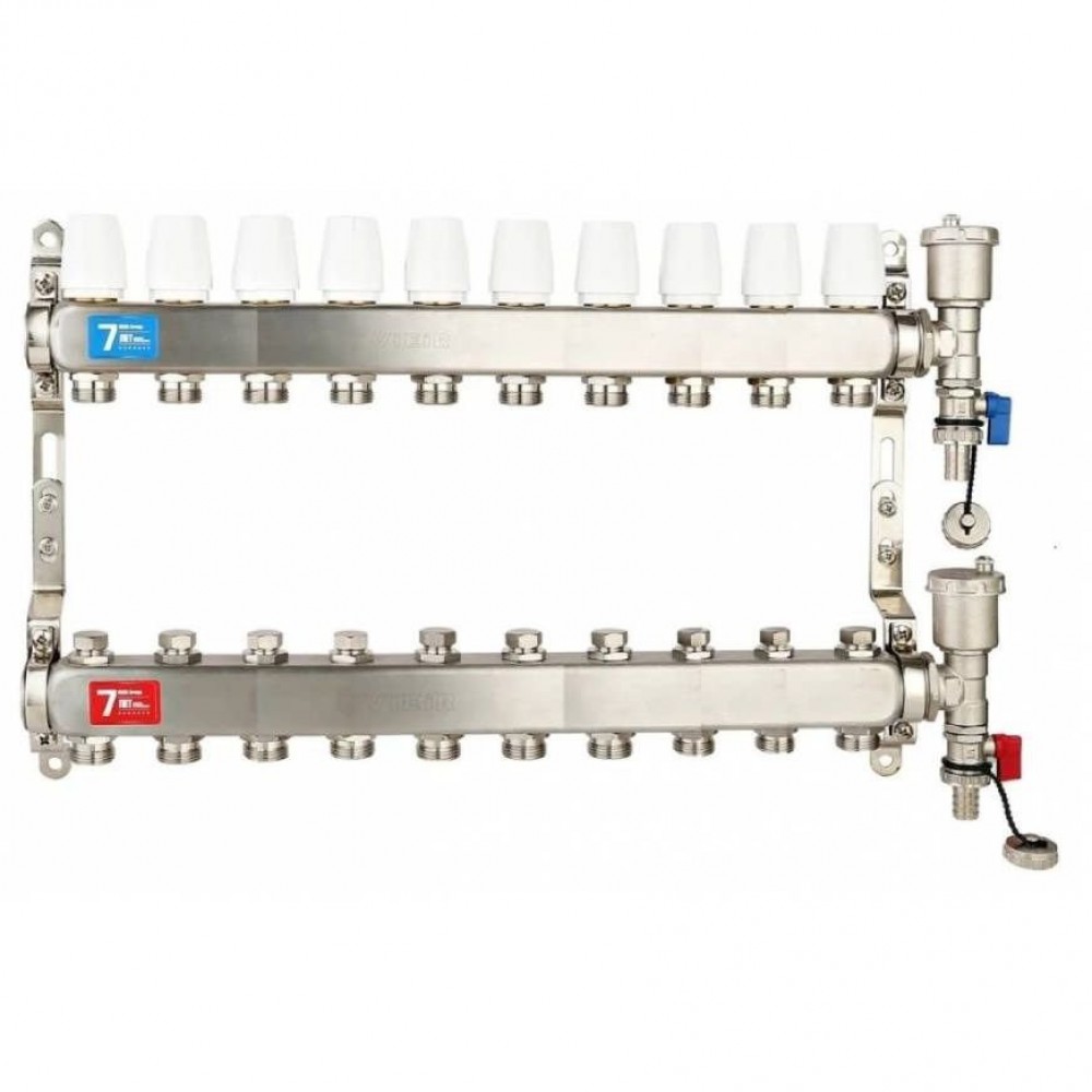 Коллекторная группа VIEIR VR115-10A 1"x3/4", 10 выходов — распределительный коллектор из нержавеющей стали для систем отопления и «тёплых полов», предназначенный для подачи и обратного сбора теплоносителя по десяти контурам без расходомеров и без шаровых кранов.