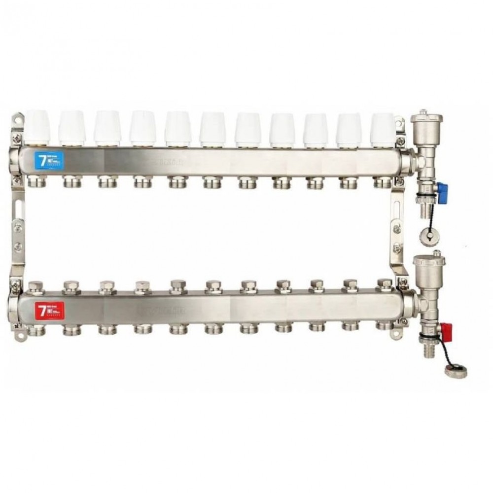 - ✓ Коллекторный блок с диаметром 1" и 11 выходами под евроконус 3/4" (НР) для распределения теплоносителя по контурам и обратного его сбора.
