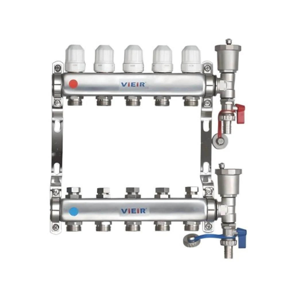 Коллекторная группа VIEIR VR115-05A 1"x3/4", 5 выходов — распределительный узел для пяти контуров отопления или «тёплого пола» без расходомеров и без шаровых кранов, с коллектором из нержавеющей стали.