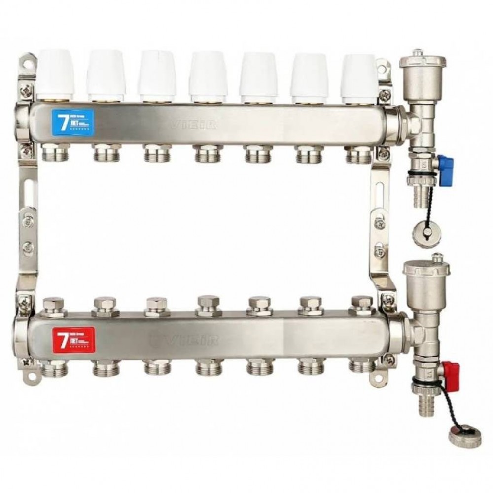 Коллекторная группа VIEIR VR115-07A 1"x3/4", 7 выходов — коллектор из нержавеющей стали для семи контуров отопления или «тёплого пола», относящийся к серии VR115A без расходомеров и без шаровых кранов.