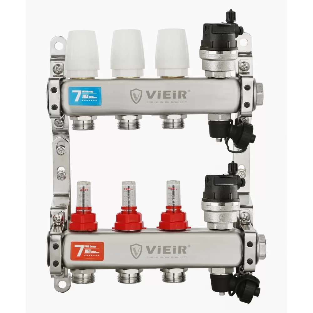 Коллекторная группа VIEIR VR123-03A 1"x3/4", 3 выхода — трёхконтурный коллекторный блок из нержавеющей стали с расходомерами для распределения теплоносителя по трём веткам отопления или тёплого пола, без шаровых кранов.