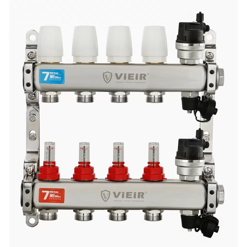 Коллекторная группа VIEIR VR123-04A 1"x3/4", 4 выхода — распределительный коллектор из нержавеющей стали с расходомерами для четырёх контуров системы отопления или водяного тёплого пола, поставляется без шаровых кранов.