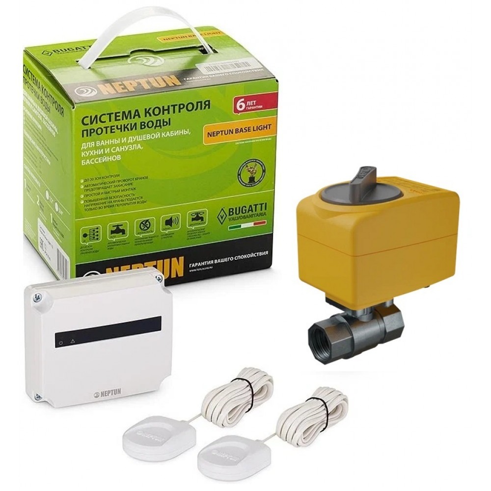 Система контроля протечки воды Neptun Base Light предназначена для своевременного обнаружения и локализации протечек воды в системе водоснабжения жилых домов, коттеджей, офисных зданий, магазинов. Основное отличие от других систем - один кран в комплекте. Система заблокирует подачу воды до устранения причин протечки и проинформирует о возникшей аварии звуковым и световым сигналами. При попадании воды на любой из датчиков, подключенных к модулю управления, управляющее напряжение подается на краны шаровые с электроприводом, подключенные к этому же модулю, которые заблокируют подачу воды. Контроль протечки воды осуществляется автоматически и не требует участия пользователя.