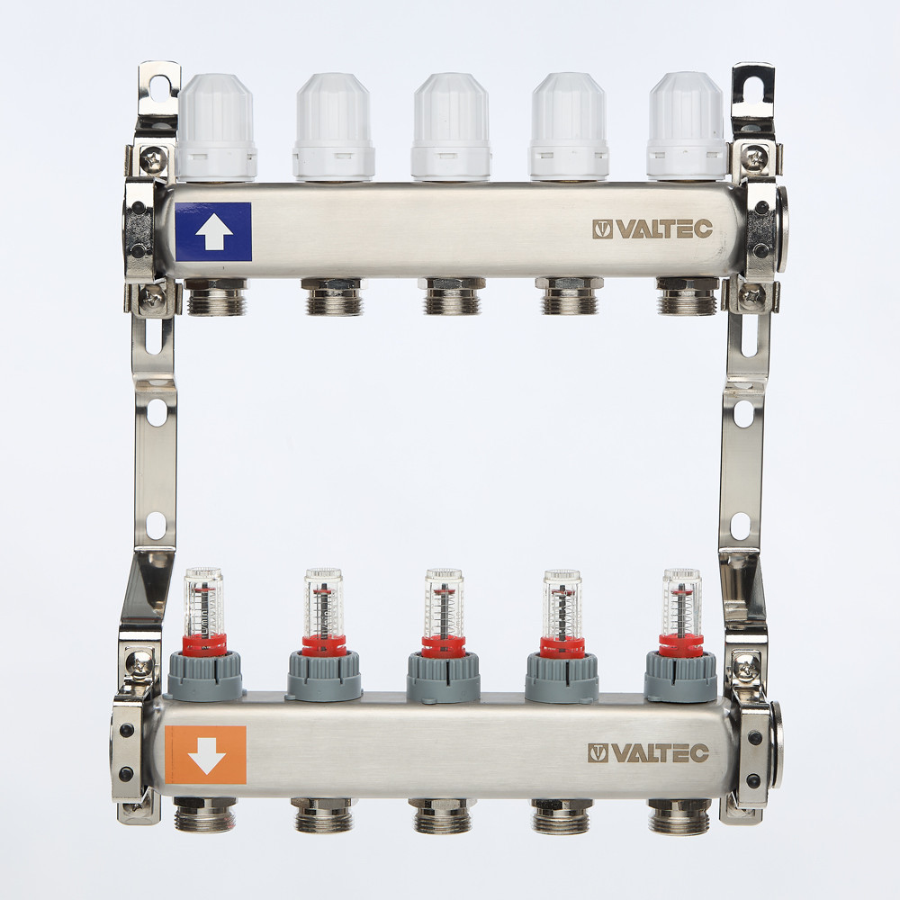 Коллекторный блок из нержавеющей стали с регулирующими клапанами и расходомерами без сервисной группы VTc.579.EMN.0605 служит для распределения потоков по контурам теплого пола, радиаторного отопления, прочих климатических систем, где в качестве теплоносителя используется вода либо незамерзающие растворы гликоля с максимальной рабочей температурой 100 °С, рабочим давлением до 10 бар.