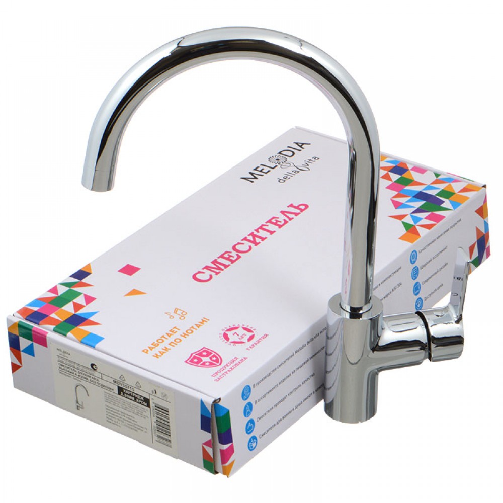 Смеситель для кухни MELODIA Aria MDV35715 — это стильный сантехнический прибор, привлекающий внимание элегантным R-образным изливом. Высота поворотного гусака составляет 21,4 см, что обеспечивает комфортное выполнение любых бытовых задач, включая набор воды в высокие фильтр-кувшины или объемные кастрюли.