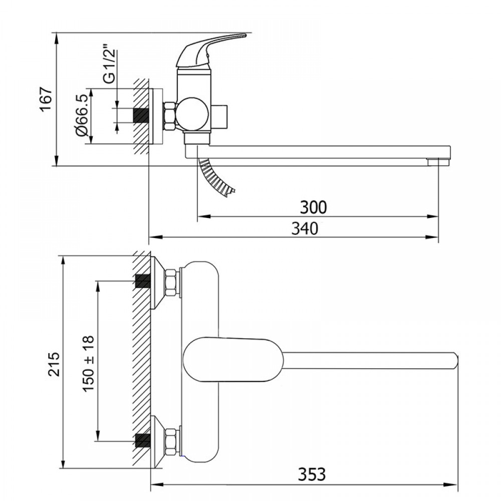 Снаружи смеситель покрыт ровным слоем хрома, защищающим поверхность от потускнения. В комплект поставки входит душевой гарнитур для комфортного проведения водных процедур. Подключение к магистрали выполняется посредством стандартного настенного крепежа.