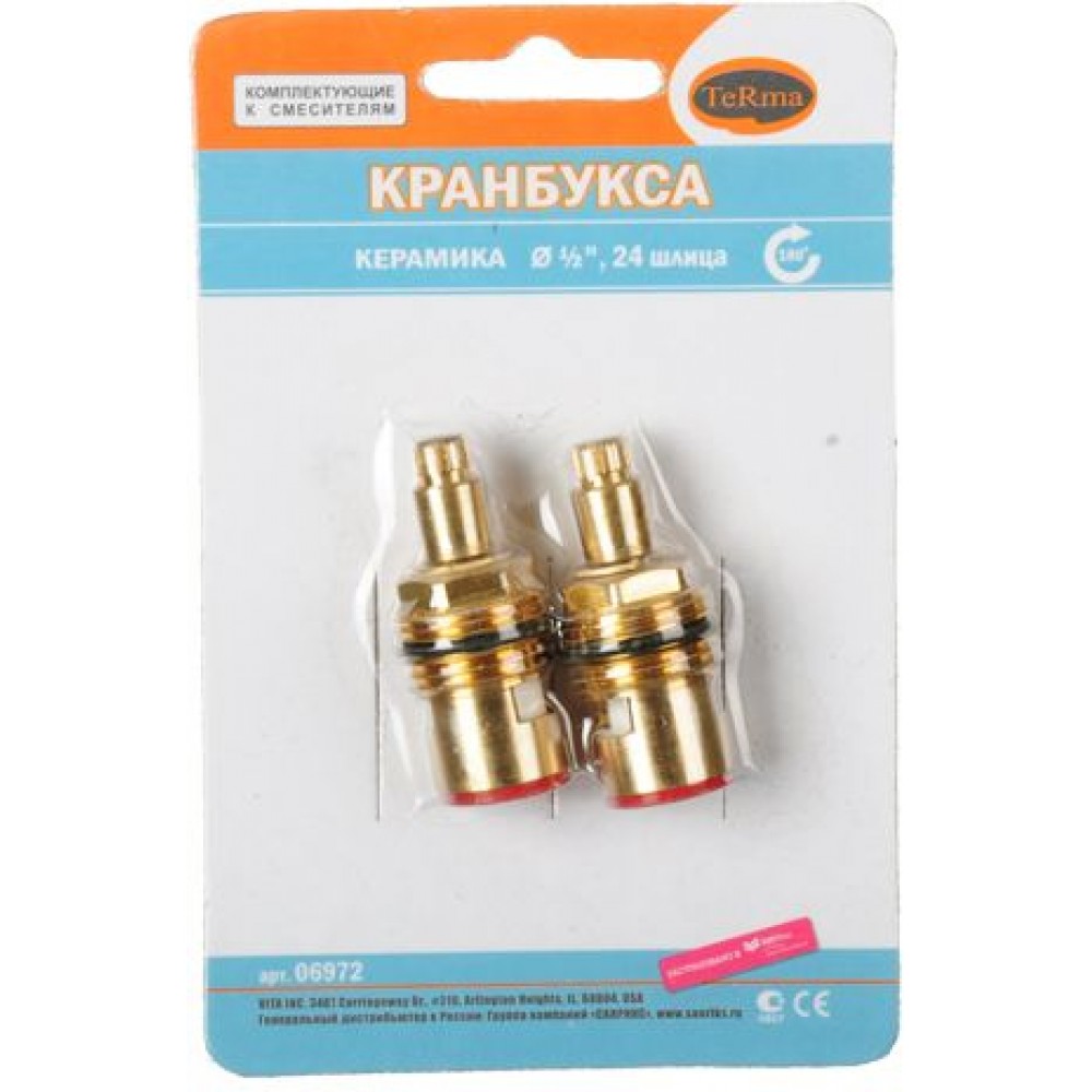 Кран-букса металлокерамическая Terma 1/2" 8х24 применяется для регулировки режима подачи и закрытия воды для смесителей с двумя маховиками (холодная и горячая вода).