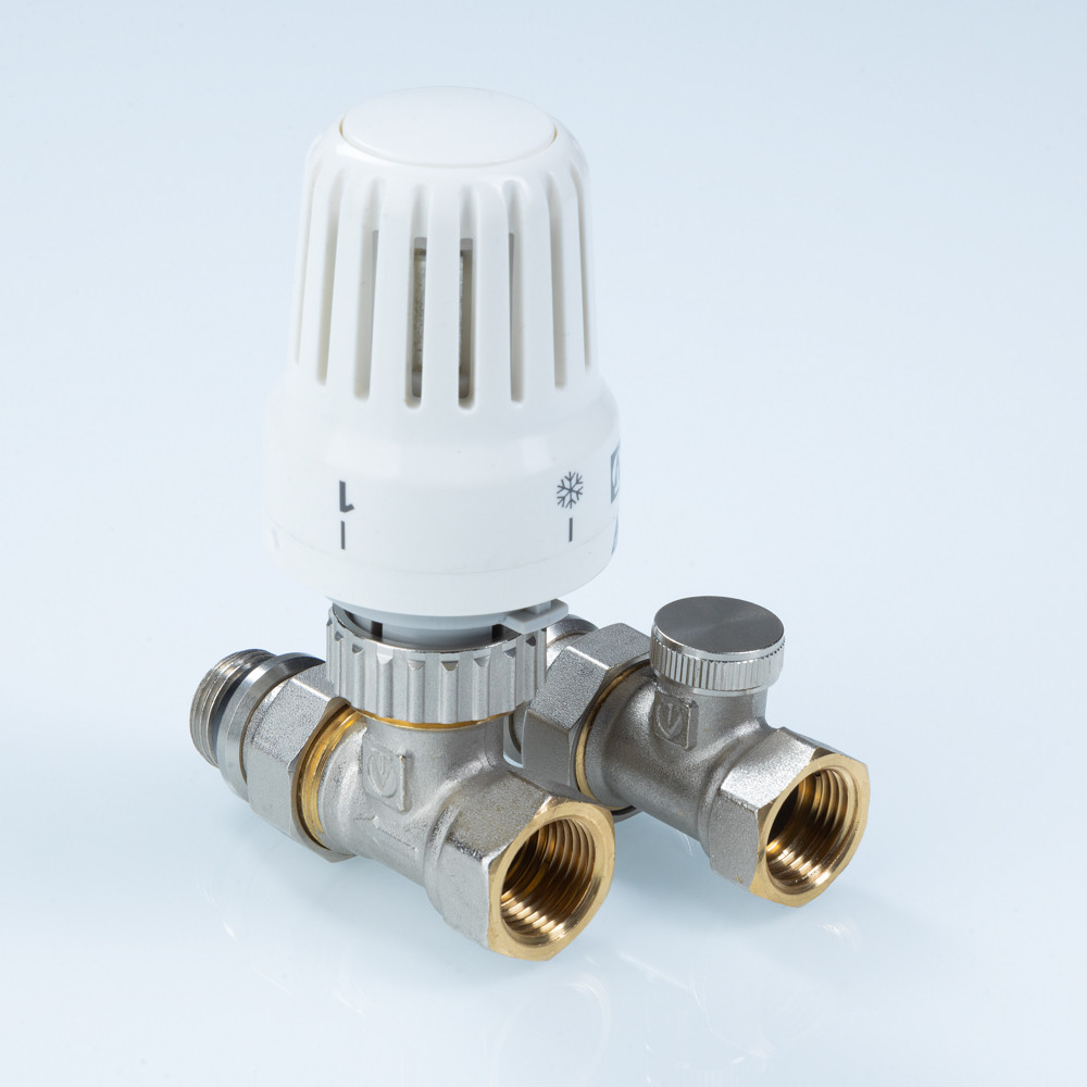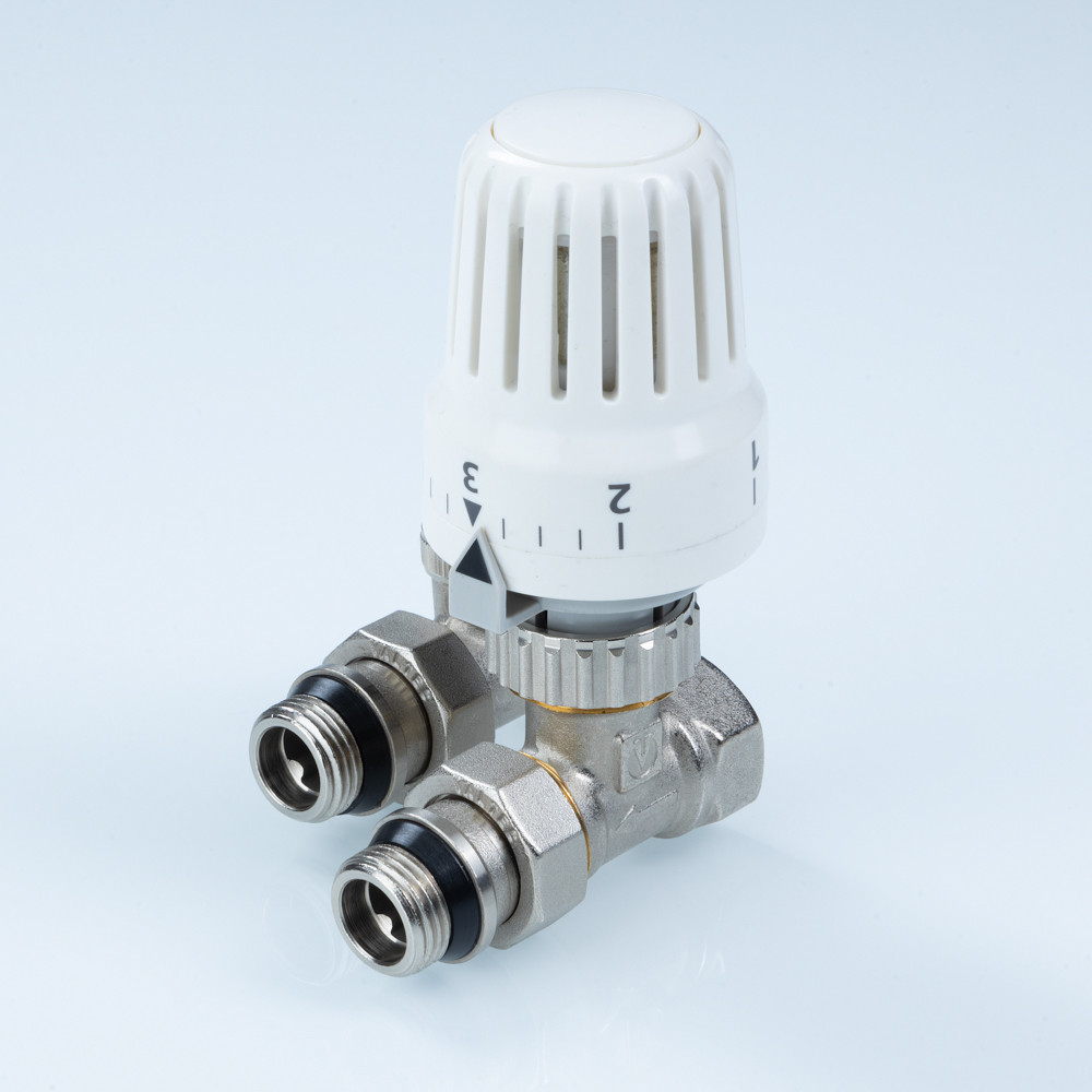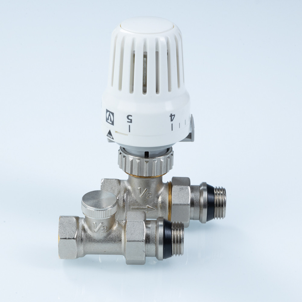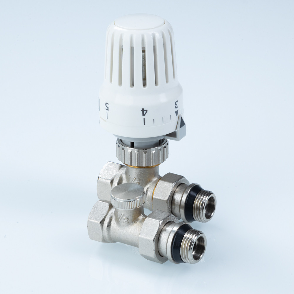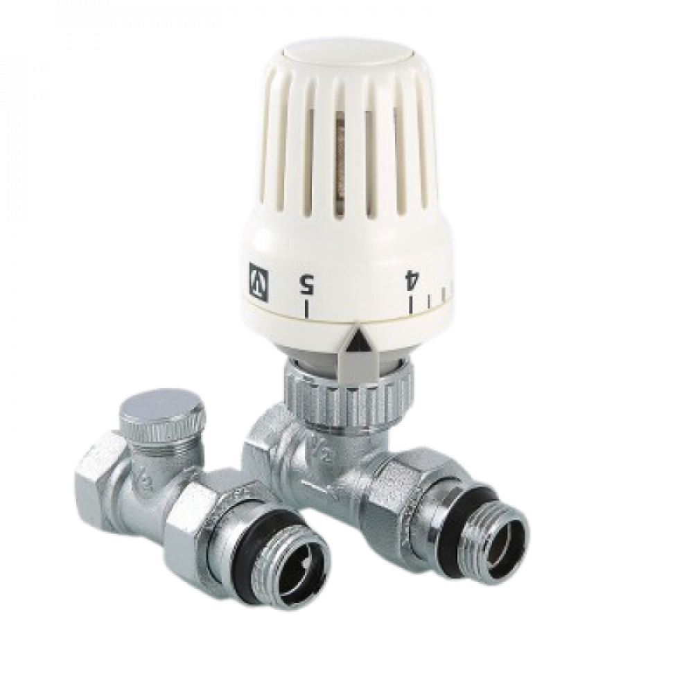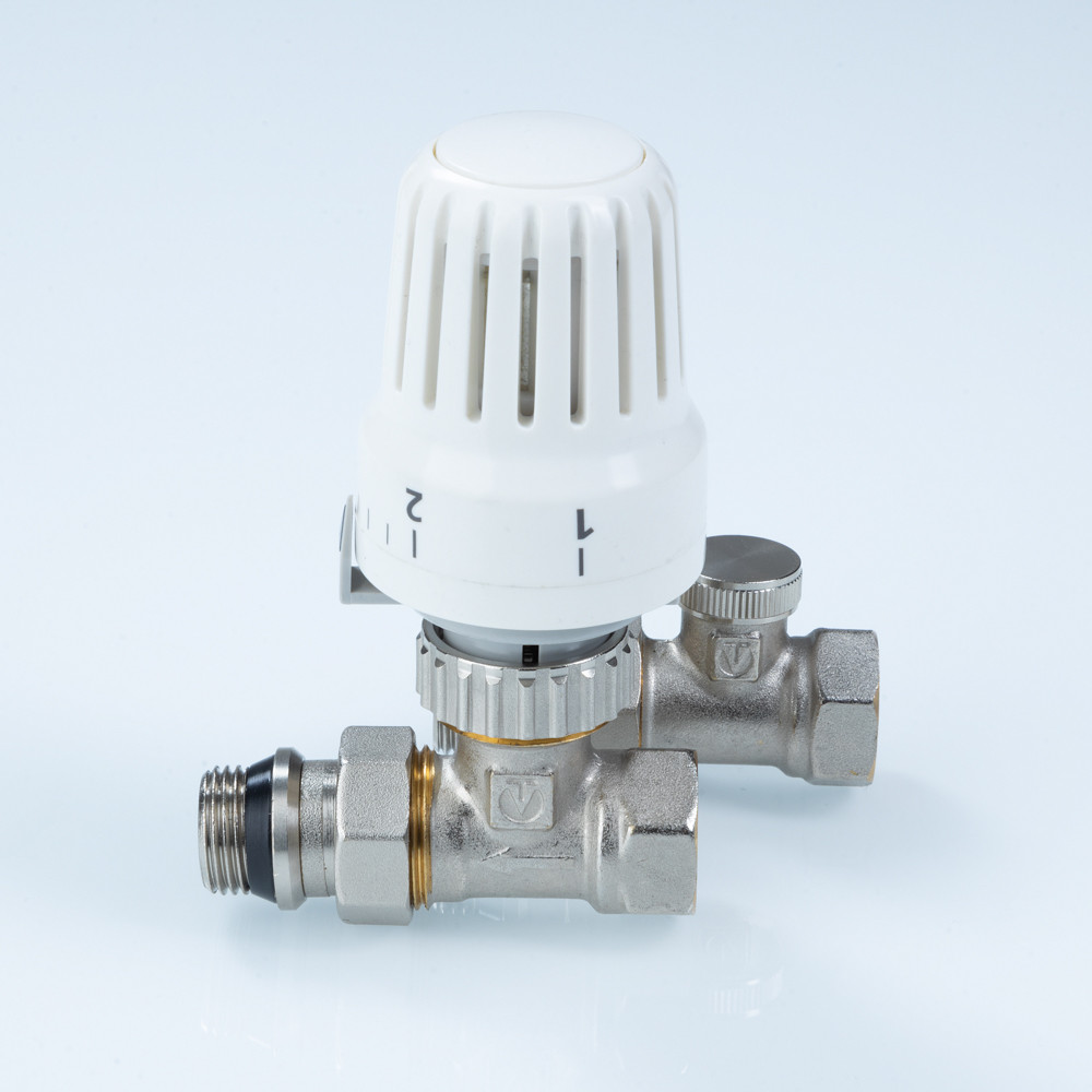 Комплект терморегулирующего оборудования VT.046 включает в себя прямые термостатический и запорно-регулировочный (настроечный) радиаторные клапаны, а также термостатическую головку. Набор предназначен для бокового подключения прибора водяного отопления, автоматического регулирования расхода теплоносителя через него в зависимости от температуры воздуха в помещении, гидравлической балансировки системы отопления. Клапаны выполнены из качественной сантехнической латуни с гальваническим покрытием и оснащены самоуплотняющимися полусгонами. Колпачок ручной регулировки на термостатическом клапане состоит из двух частей – неподвижной нижней и вращающейся верхней. Это позволяет многократно производить монтажную настройку клапана в условиях строительства (до установки термостатической головки), не переживая за целостность резьбы на пластиковом колпачке. Комплект помещен в пылевлагозащитную упаковку (блистер). Стоимость данного комплекта меньше, чем при раздельной покупке входящих в него элементов.