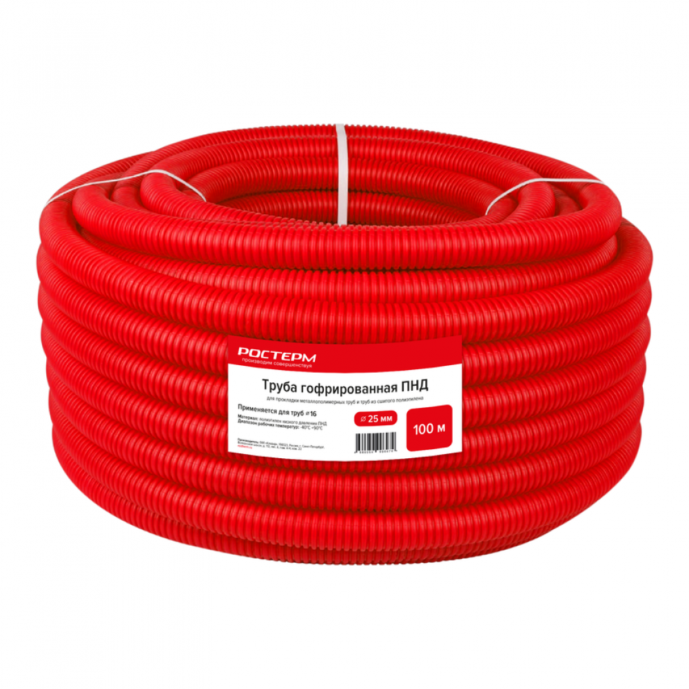 Труба гофрированная ПНД d25 мм 100 м красная изготовлена из полиэтилена низкого давления (ПНД) диаметром 25 мм, для полимерных труб диаметром 16 мм, применяется преимущественно для скрытого монтажа в бетонной стяжке для горизонтальных систем отопления, водоснабжения и систем поверхностного обогрева. Труба гофрированная используется как защитный кожух для системы водоснабжения и отопления от механических повреждений, воздействия внешней среды и обеспечивает компенсацию температурного расширения трубопроводов в стяжке.Преимущества: